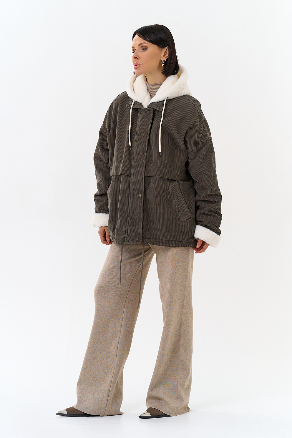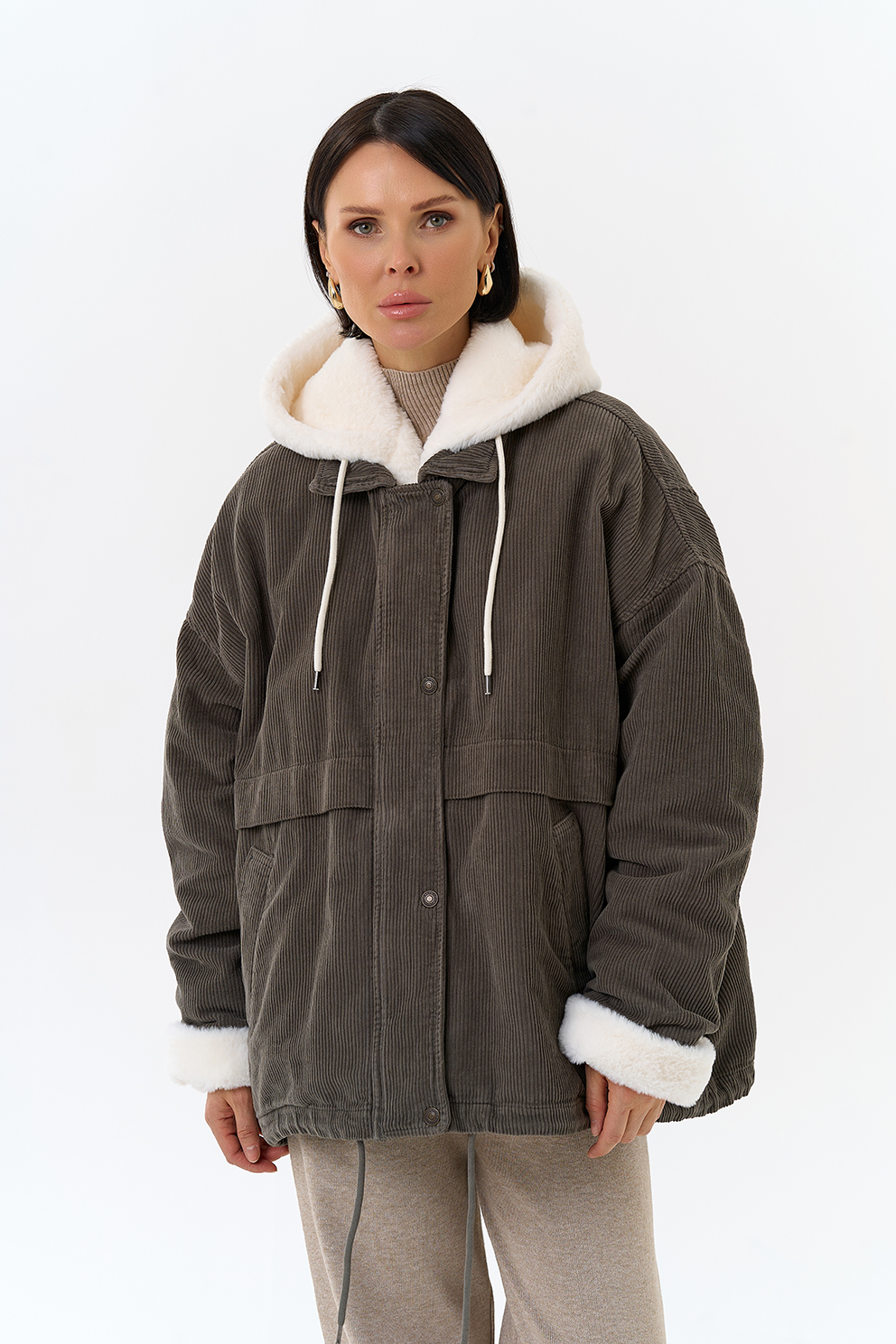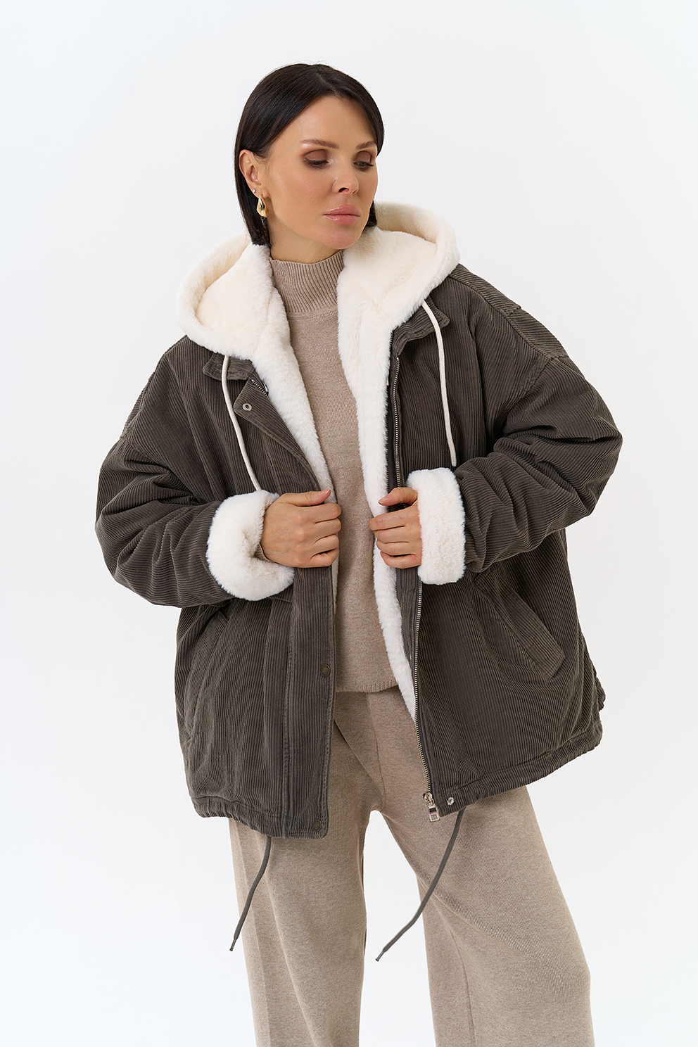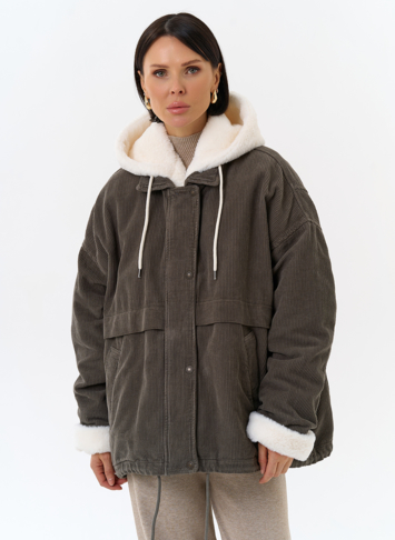 Крой воротника - съемный капюшон, отделка эко мех